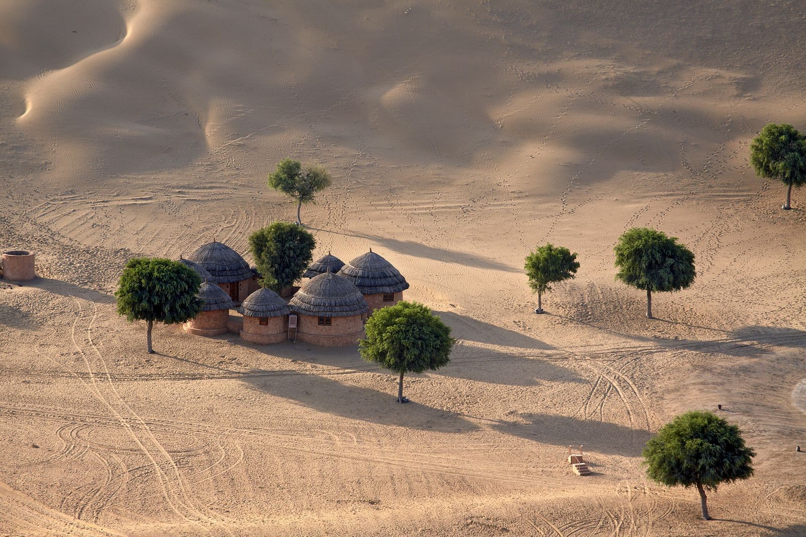 Khimsar · 1 NachtKein Zeltcamp, sondern ein Wüstendorf aus traditionellen Dhani-Hütten mit Lehmwänden und Strohdächern, errichtet um eine Oase mit See mitten in den Dünen. Erreichbar nur per Jeep oder Kamel.